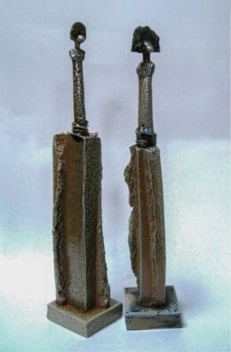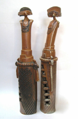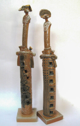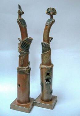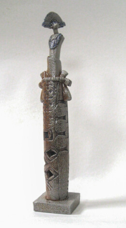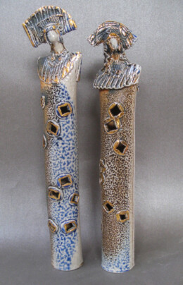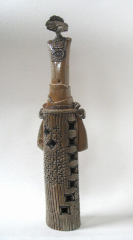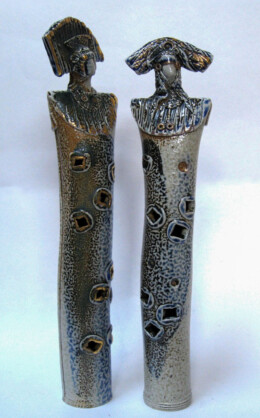 A gas kiln has a chimney to help suck the gas flame through and around the work inside. Both salt and soda vapourise at high temperature and can be carried through the kiln by the flame on it’s journey to the chimney, swirling around the work in it’s path. On it’s way the vapour combines with the surface of the clay to make a natural glaze building up mostly on edges and textures and on more intricate areas of the work. My new task was to make forms that might encourage this interaction – to make the kiln part of the creative process. And so began the next journey. Cylinder figures with their costume adornments and textures allowed me to play with forms and utilize the effects created during the soda firings.